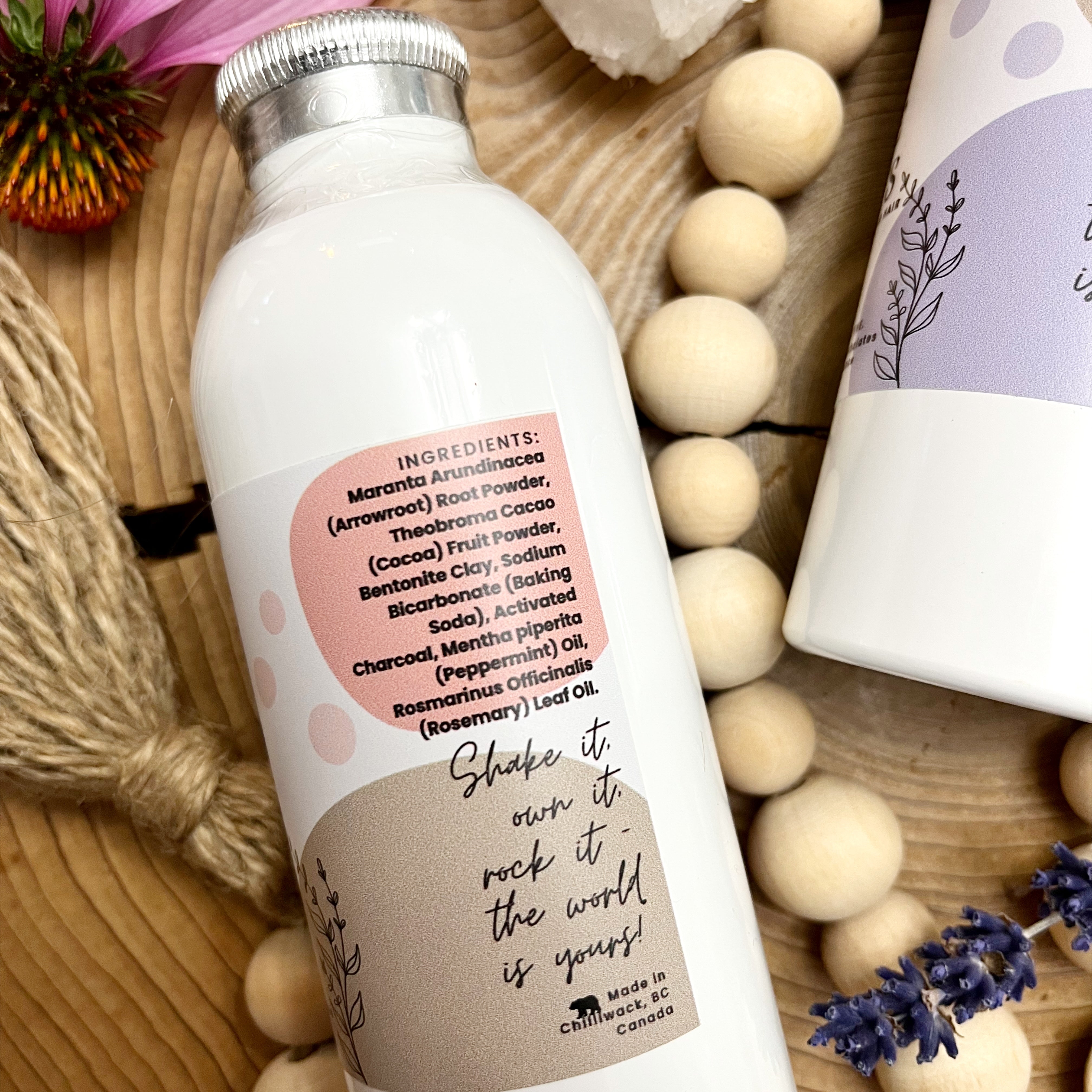DARK HAIR: Maranta Arundinacea (Arrowroot) Root Powder, Theobroma Cacao (Cacao) Powder, Carbo Activatus (Activated Charcoal), Sodium Bentonite (Bentonite Clay) Powder, Sodium Bicarbonate (Baking Soda), Mentha piperita (Peppermint) Oil, Rosmarinus Officinalis (Rosemary) Leaf Oil.