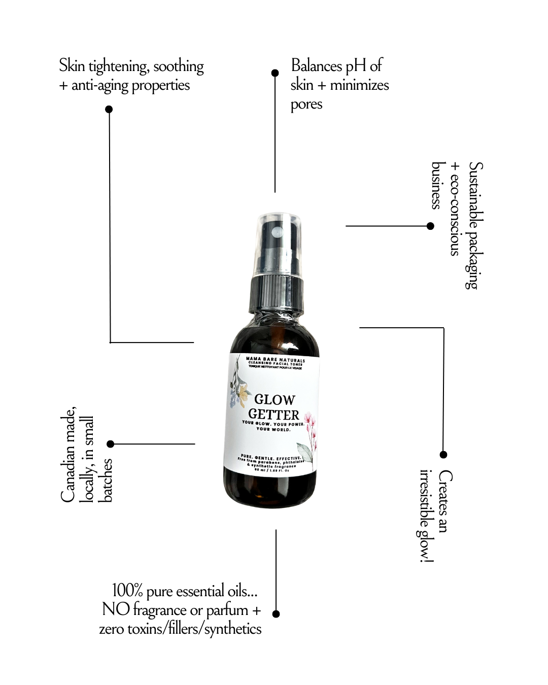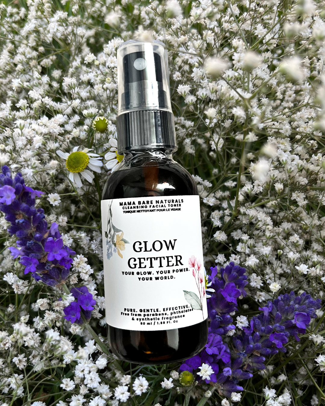 Glow Getter is a natural, plant-powered facial toner crafted to hydrate, balance, and revitalize your skin while restoring its natural radiance. Infused with geranium, lavender, and chamomile essential oils, this botanical blend soothes irritation, tightens pores, and supports a healthy, youthful complexion.