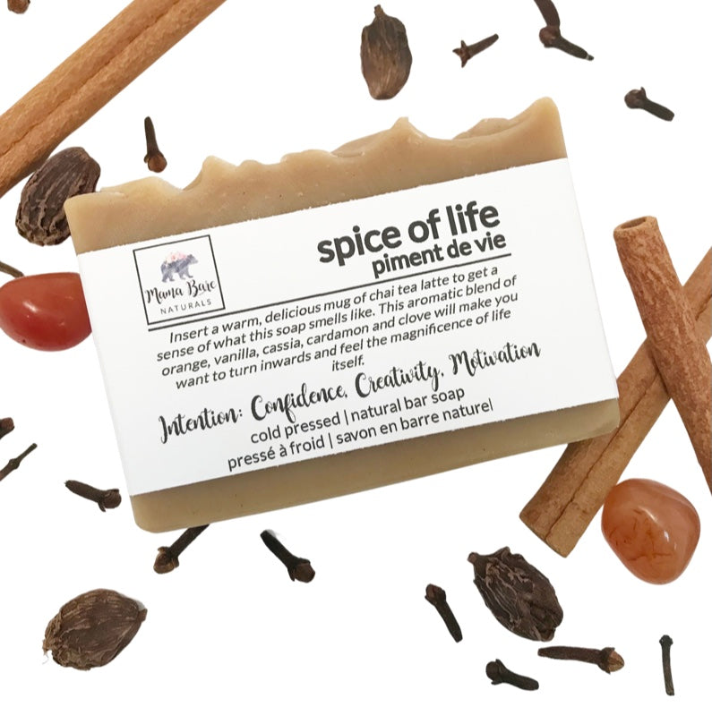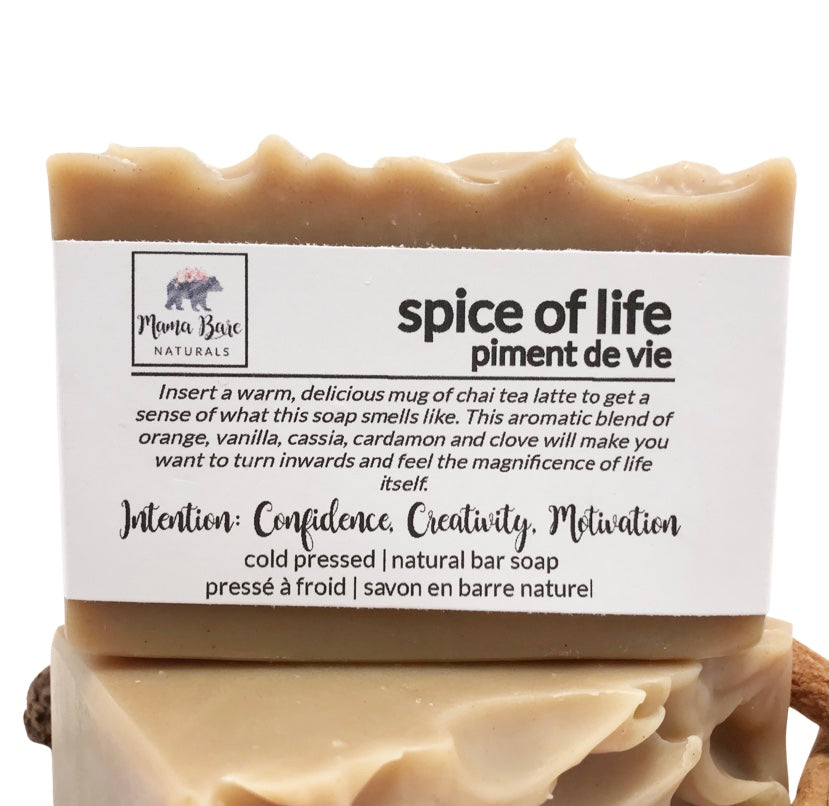 Visualize a warm, spicy mug of chai tea latte to get a sense of what this soap smells like. The aromatic blend of orange, clove, nutmeg, cassia, patchouli and ylang ylang will make you want to turn inwards and feel the magnificence of life itself. This soap packs a powerhouse punch of antioxidants and skin healing properties. The special blend of essential oils are naturally antiseptic, antibacterial, antiviral, promotes skin elasticity, promotes collagen production, assists in cell regeneration and protects the skin from UV damage and aging (to name a few!). This bar will create a creamy and sudsy lather that is rich and satisfying, leaving the skin feeling moisturized and healthy.