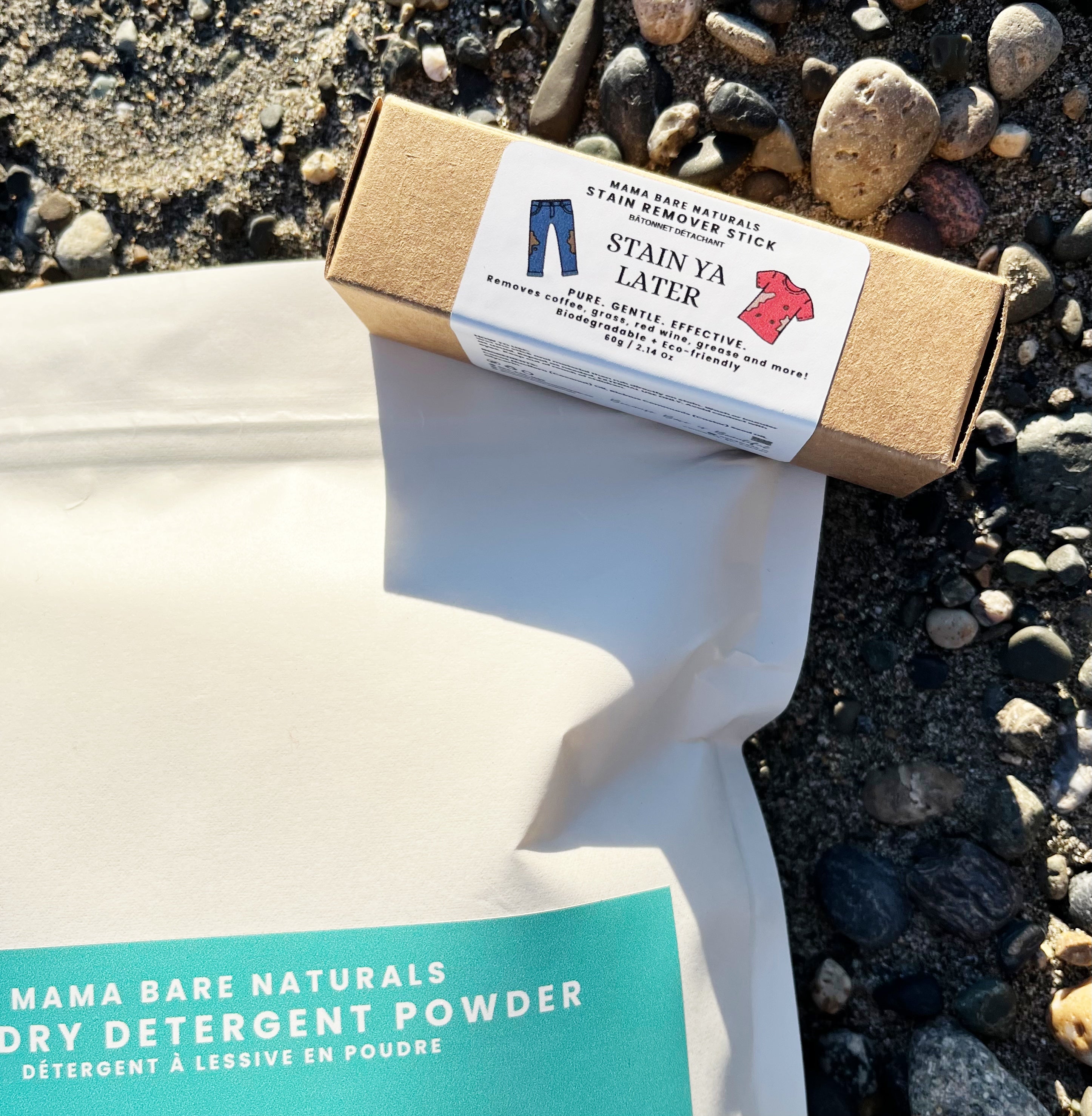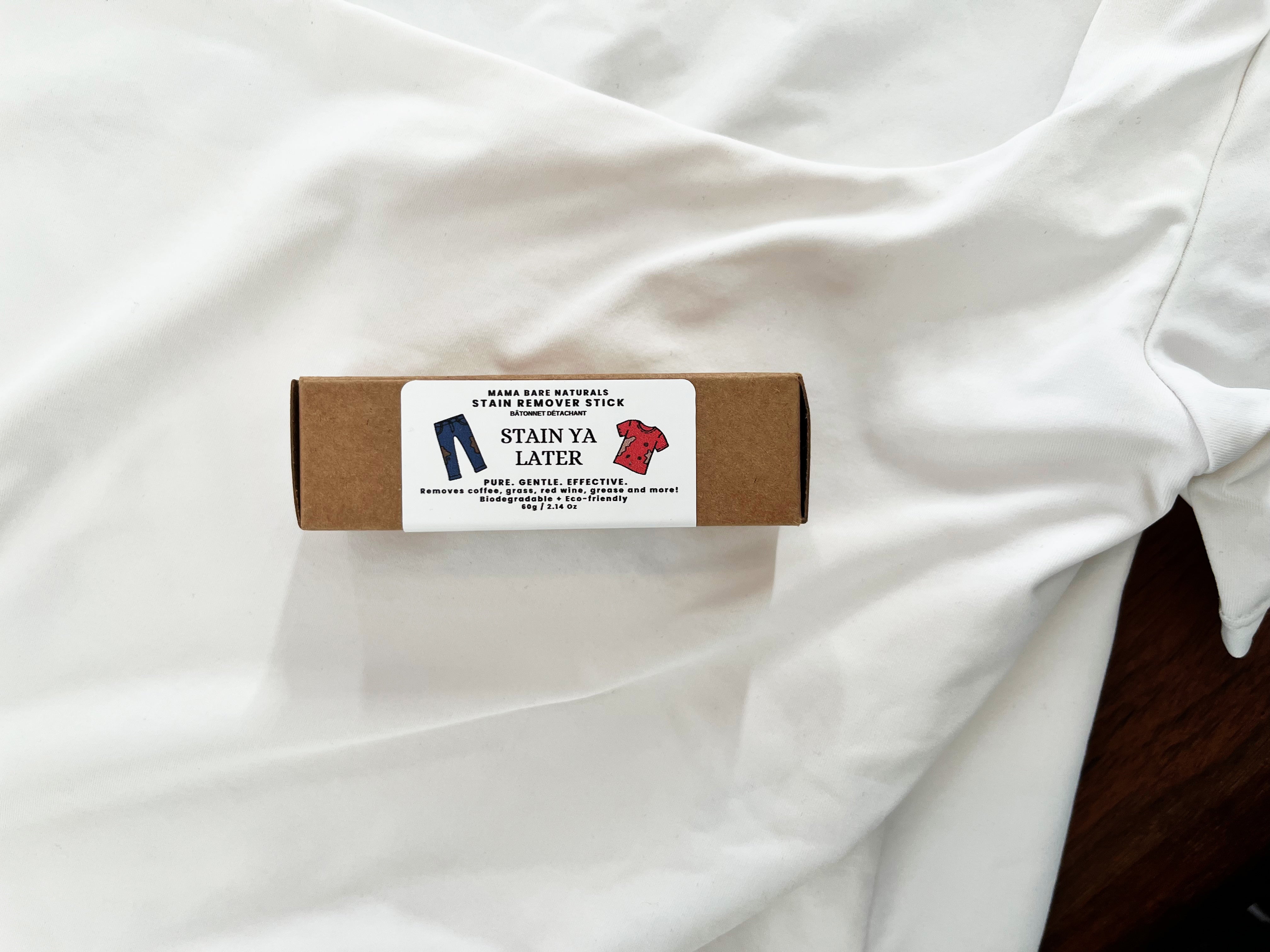 Our "stain ya later" natural stain remover bar is an effective stain remover that's eco-friendly and biodegradable. Made with plant-based ingredients and free from synthetic fragrances, dyes, and harsh chemicals. Removes coffee, grass stains, red wine, grease, make-up, pet messes, blood and more!