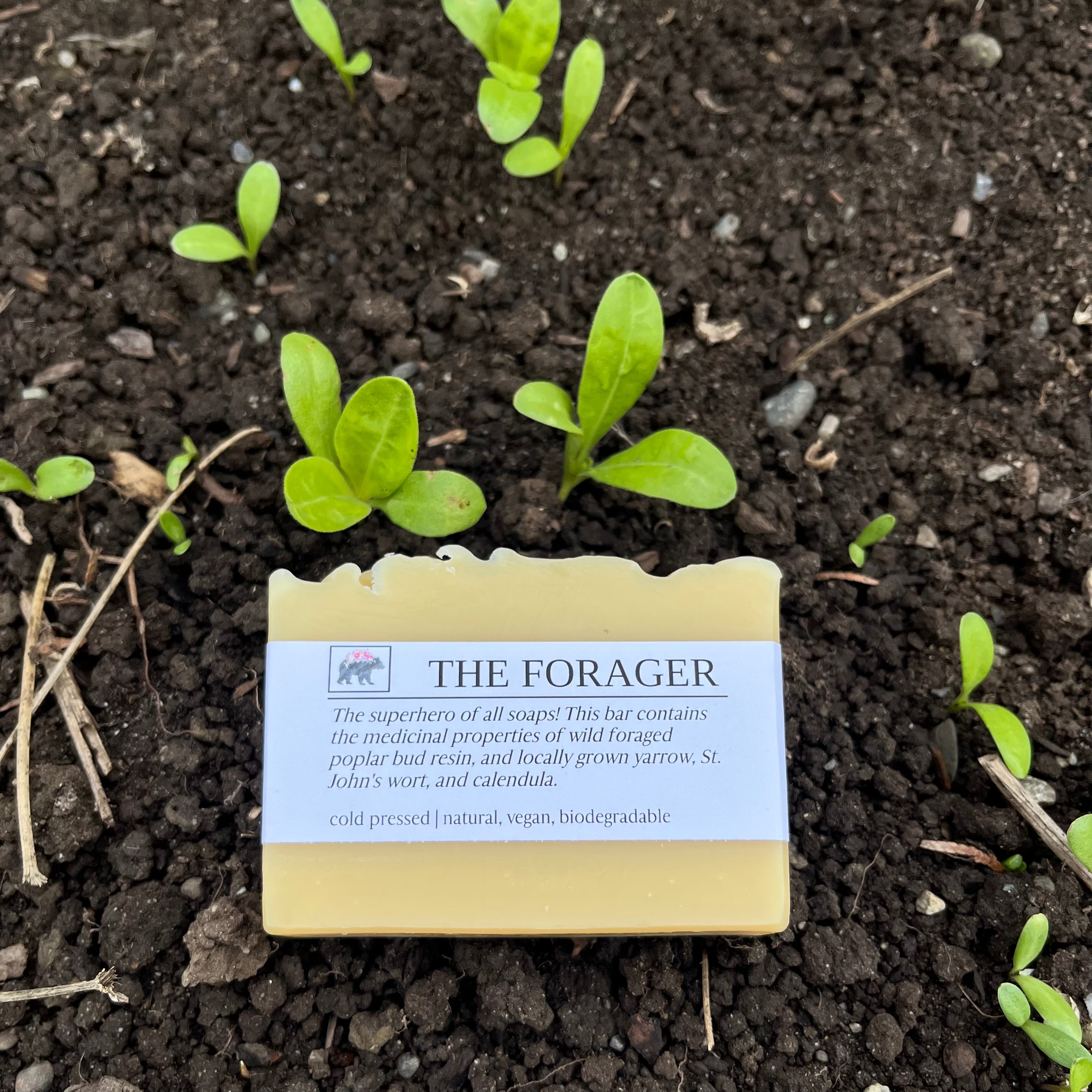 The Forager bar is fantastic for those with sensitive, dry or irritated skin due to the medicinal properties of wild foraged poplar bud resin, and locally grown yarrow, St. John's wort, and calendula. A few benefits of these botanicals include cell regeneration, anti-inflammatory properties, antibacterial, increased softness and hydration of the skin, reduced skin irritation, and helping to soothe eczema. We have also added the essential oils (no fragrance oil here!) of clementine, fennel, lemongrass and a touch of peppermint for a truly satisfying scent. The bar creates a creamy and sudsy lather that is rich and satisfying, while leaving your skin feeling moisturized and healthy.